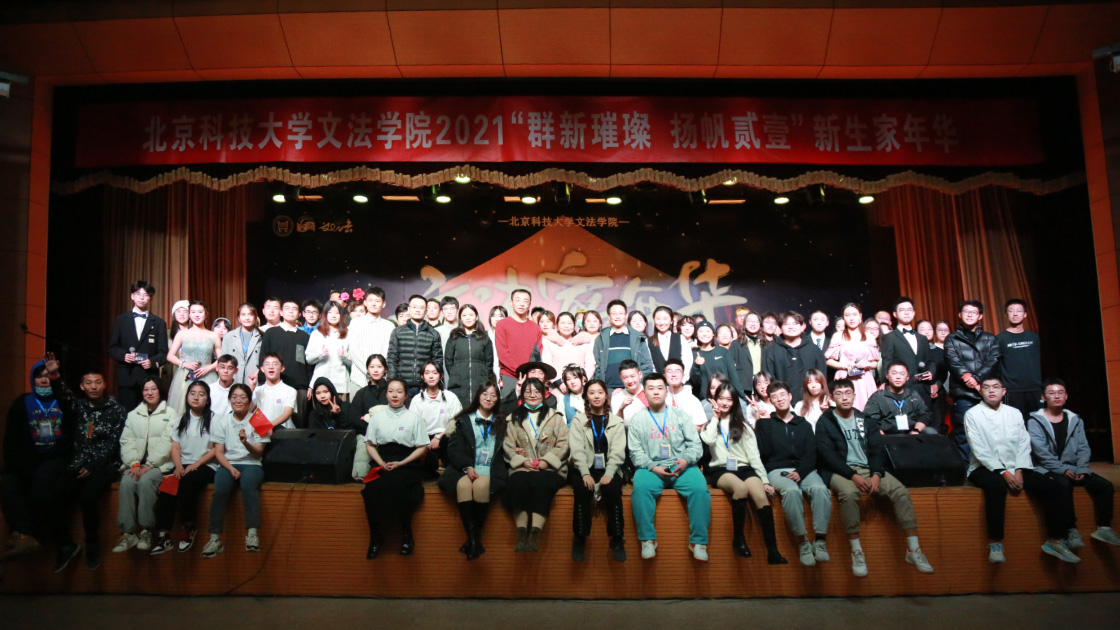 至此,北京科技大学2138CC太阳集团第九届文法家年华暨2021级新生迎新晚会圆满结束,领导嘉宾与全体演职人员合影留念。