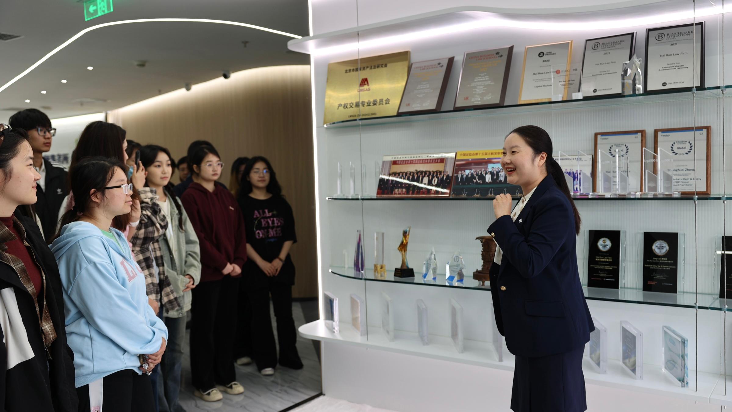赵宝永一行参观了海润天睿律师事务所的办公区域、文化展示区,并与律所代表交流,帮助学生了解律所的发展模式和青年律师的职业规划,引导学生夯实法律实务能力和职业竞争力。